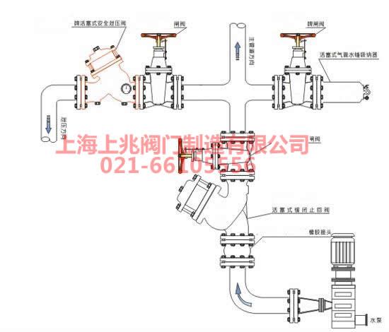 六、YQ98002型過濾活塞式安全泄壓閥--安裝方式及連接要求: 一、根據(jù)工況的減壓特性,必須在該閥前安裝 閘閥; 二、方便日后對(duì)該閥進(jìn)行檢修工作.必須在減壓閥后安裝可曲繞軟連接; 三‘最佳安裝方式為臥式,其它方位也可以接受; 四、必須留出足夠的工作空間方便檢修; 五、吊裝時(shí)采用有效措施進(jìn)行.也可利用該閥吊環(huán)進(jìn)行。 七、YQ98002型過濾活塞式安全泄壓閥--安裝圖: