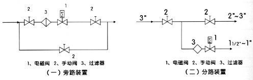 3、在電磁閥發(fā)生故障時,為了及時隔離電磁閥,并保證系統(tǒng)正常運行,最好安裝旁路裝置(如圖一)。