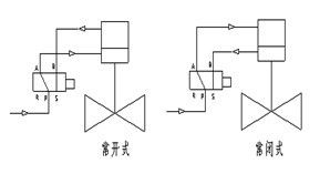 當控制器按事先編好的程序對某個電磁換向閥輸出一個電信號,該電磁換向閥動作,使帶壓儀表氣過電磁換向閥的切換進入氣動執(zhí)行機構的氣缸上腔或下腔,推動活塞運動使閥們開啟或關閉。閥門的工作流向應是高進低出(如圖所示)。 |
