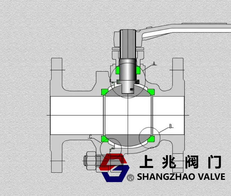 閥桿處防火。指閥桿密封填料,聚四氟乙烯被高溫熔化,閥體內(nèi)壓力會(huì)將閥桿頂出閥體,閥桿上的臺(tái)肩被閥體擋住。并借助閥體內(nèi)壓力把閥桿壓緊,形成密封。這種下裝式閥桿同時(shí)能夠防止球閥中腔異常升壓時(shí),閥桿被介質(zhì)壓力頂出閥體,保證安全。填料可以采用耐高溫的柔性石墨填料,石墨金屬絲組合壓制等特殊填料。