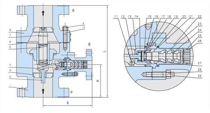 產(chǎn)品介紹 一、自動(dòng)回流三通閥產(chǎn)品概述: ZDM/ARC1000 自動(dòng)回流三通閥是一個(gè)獨(dú)立的多功能控制系統(tǒng),能夠動(dòng)態(tài)的感知主流道的變化,隨主流道調(diào)節(jié)旁路介質(zhì)流量,它積極了截止閥,止回閥,多級(jí)調(diào)節(jié)閥減壓閥功能于一身。自動(dòng)再循環(huán)閥安裝于鍋爐給水泵出口、對(duì)給水泵起安全保護(hù)作用。泵保護(hù)閥(它)用于防止給水泵的低負(fù)荷運(yùn)行時(shí)由于過(guò)熱、嚴(yán)重噪音,不穩(wěn)定汽蝕引起損壞。 二、自動(dòng)回流三通閥工作原理: ZDM/ARC1000自動(dòng)回流三通閥介質(zhì)經(jīng)過(guò)閥門(mén)入口進(jìn)入閥體,閥芯同時(shí)也是測(cè)量部件感受到流量通過(guò),當(dāng)流量小于設(shè)定值時(shí),液體通過(guò)閥座上的開(kāi)孔并通過(guò)閥桿同時(shí)也是旁路閥芯的減壓調(diào)節(jié)通道做旁路循環(huán)。當(dāng)出口流量大于所設(shè)定流量時(shí),流體進(jìn)入主管道中并逐漸關(guān)閉旁路,進(jìn)行正常流動(dòng)。 據(jù)感應(yīng)到的主路流量不同,自動(dòng)再循環(huán)泵保護(hù)閥的主閥瓣止回錐將自動(dòng)移動(dòng)到某一個(gè)位置上。同時(shí)主閥瓣帶動(dòng)旁路閥閥桿,將主閥瓣動(dòng)作傳遞至旁路,通過(guò)控制旁路閥閥瓣的位置,改變旁路的節(jié)流面積,從而控制通過(guò)旁路的流量。當(dāng)主閥瓣回至閥座關(guān)閉狀態(tài)時(shí),所有流量通過(guò)旁路回流。當(dāng)主閥瓣上升至頂端位置時(shí),旁路則完全關(guān)閉,所有泵的流量流向工藝系統(tǒng)。該閥集四種功能于一體。 流量感知:自動(dòng)再循環(huán)閥的主閥瓣能自動(dòng)感知工藝系統(tǒng)中的主流量,從而根據(jù)此流量來(lái)確定主閥瓣和旁路閥瓣的位置。 再循環(huán)控制:自動(dòng)再循環(huán)泵保護(hù)閥可以將泵正常運(yùn)行所需要的最小流量通過(guò)旁路吸入到存儲(chǔ)裝置中,調(diào)節(jié)水泵的H-Q特性,實(shí)現(xiàn)再循環(huán)。 旁路多級(jí)減壓:旁路控制系統(tǒng)能低噪音小磨損的把回流介質(zhì)從泵出口的高壓減至適宜回流存儲(chǔ)裝置中的低壓。 止回:自動(dòng)再循環(huán)閥還具有止回閥的作用,防止液體回流到泵體中。標(biāo)準(zhǔn)型旁路帶止回功能。 其它旁路尺寸可按要求制作;最大的旁路流量取決于最大的Kv值 三、自動(dòng)回流三通閥性能優(yōu)勢(shì): 1.包括回流的減壓設(shè)施,使高壓介質(zhì)經(jīng)多次小通徑繞流,消耗大量的能量,而降低壓力。 2.只在流量很低時(shí)才有回流功能,使泵冷卻,在泵正常運(yùn)行時(shí),并沒(méi)有回流,從而可節(jié)省因連續(xù)再循環(huán)所消耗的電能和水能。 3.自動(dòng)回控制閥不需要電氣配線,也不需要兩個(gè)調(diào)節(jié)閥串聯(lián),一個(gè)用于調(diào)節(jié),另一個(gè)用于切斷。并把高壓系統(tǒng)容易產(chǎn)生的高速流拉線和侵蝕現(xiàn)象減到zui少。 4.具有設(shè)計(jì)合理,運(yùn)行平穩(wěn),無(wú)噪音,壽命長(zhǎng)等特點(diǎn),可完全替代進(jìn)口產(chǎn)品。 5.閥門(mén)應(yīng)垂直安裝。 四、自動(dòng)回流三通閥結(jié)構(gòu)參數(shù): 1、公稱(chēng)通徑:DN40~350 2、公稱(chēng)壓力:PN10-PN420 3、旁路尺寸1-8(標(biāo)準(zhǔn));或特殊 4、推薦流速:4~6米/秒 zui高8米/秒 5、連接方式:法蘭連接(ANSI或DIN) 6、鑄碳鋼,鍛碳鋼,鑄鉻鎳鉬鈹不銹鋼,鍛鉻鎳鉬鈹不銹鋼 五、自動(dòng)回流三通閥結(jié)構(gòu)圖 :![]() | ||