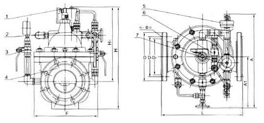 當(dāng)水泵停止工作時,電磁導(dǎo)閥先關(guān)閉,主閥控制室停止排水,控制室壓力升高,主閥開始關(guān)閉。當(dāng)關(guān)閉至90%時,主閥上部行程開關(guān)輸出停泵信號,水泵停止運(yùn)轉(zhuǎn)。此時下游回水經(jīng)單向閥進(jìn)入主閥控制室,控制室壓力升高,主閥被關(guān)閉 三、700X多功能水泵控制閥--主要技術(shù)參數(shù)