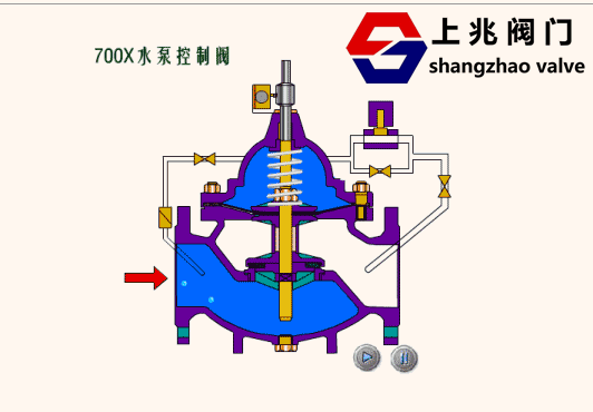 700X多功能水泵控制閥由主閥、電磁導(dǎo)閥、針閥、球閥、單向閥、行程開關(guān)、微形過濾器和壓力表組成水力控制接管系統(tǒng)。水泵需停止工作時,先由進(jìn)口壓使主閥關(guān)閉90%后,水泵停止運(yùn)轉(zhuǎn)。剩余10%由回水關(guān)閉。可防止水錘現(xiàn)象發(fā)生。本產(chǎn)品利用電磁導(dǎo)閥控制,不需要其它裝置和能源。節(jié)約能源,保養(yǎng)簡便,停泵平穩(wěn)。電磁閥可采用交流電220V或直流電24V。 二、700X多功能水泵控制閥--工作原理