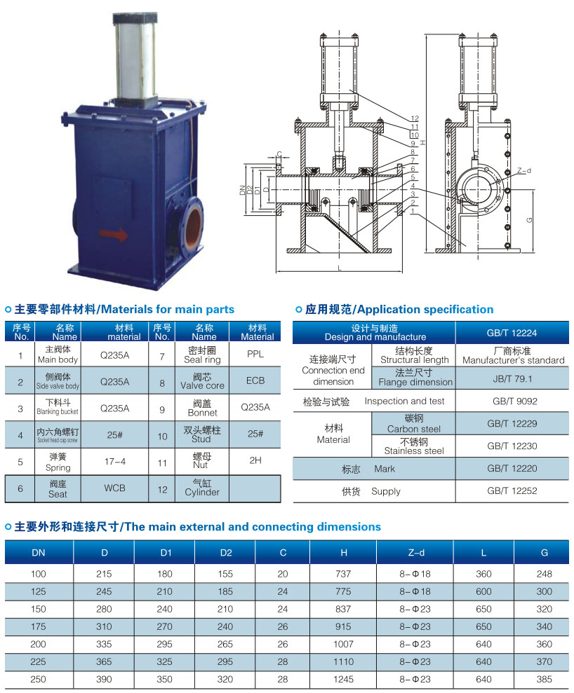 安裝前應(yīng)將閥門清洗干凈,并消除在運(yùn)輸過程中可能造成的缺陷。仔細(xì)核對閥門上的標(biāo)識及銘牌是否符合使用要求。本閥門只能安裝在水平管道上。若長期存放,應(yīng)存在于干燥通風(fēng)的室內(nèi),定期檢查,防止生銹。運(yùn)輸過程中防止磕碰。 庫頂切換閥--技術(shù)參數(shù): 1、 公稱通徑: DN50~900mm(2”~36”) 2、 公稱壓力: PN1.0~4.0MPa(150~300Lb) 3、 適用溫度: ≤200℃ 4、 適用介質(zhì):灰渣、泥渣、煤渣、礦漿、污水等 5、 應(yīng)用范圍:電力、石化、冶金、建材等工藝控制系統(tǒng) 6、 材質(zhì): 碳鋼 不銹鋼等 ![]() | ||