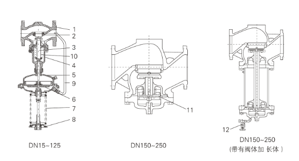 | 結(jié)構(gòu)簡圖 | | 1 | 2 | 3 | 4 | 5 | 6 | 7 | 8 | 9 | 10 | 11 | 12 | | 閥體 | 閥座 | 閥軸 | 閥蓋 | 膜蓋 | 膜片 | 彈簧 | 調(diào)節(jié)螺母 | 導(dǎo)壓管 | 波紋管 | 平衡膜片 | 充注閥 |